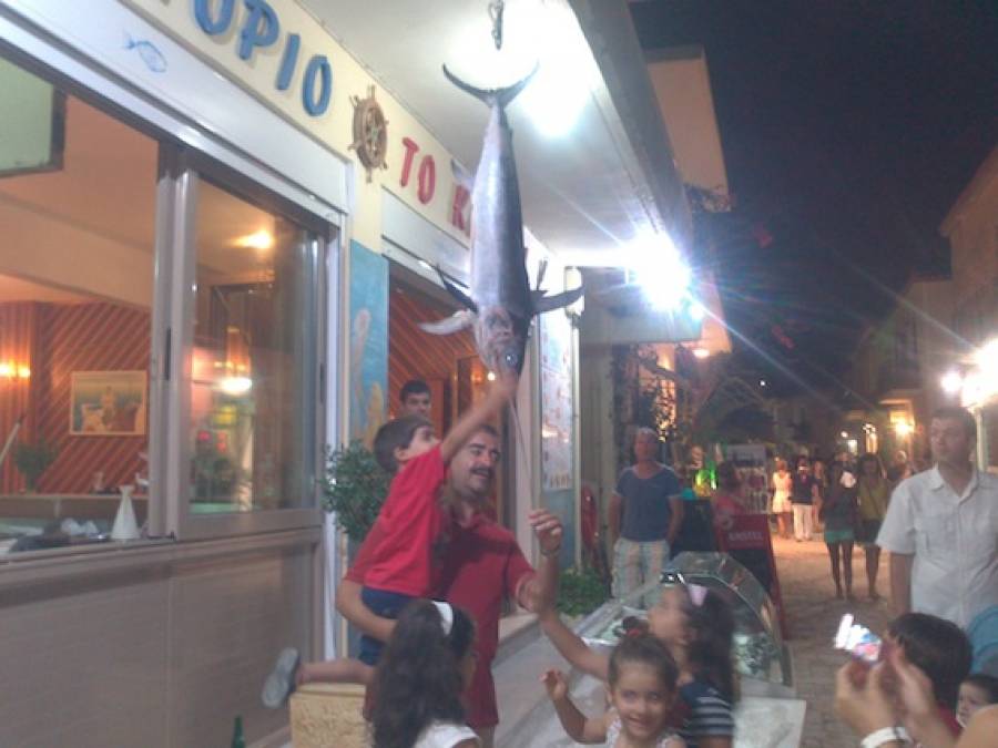 ΑΥΤΟΣ ο εντυπωσιακός ξιφίας τράβηξε τα βλέμματα των περαστικών και κυρίως των παιδιών που περνούσαν μπροστά από το εστιατόριο "Καράβι" στη Φοινικούντα, το Σάββατο το βράδυ.