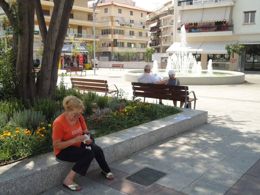 Για την ακρίβεια, μόνο δύο παγκάκια στη βόρεια πλευρά, στο ύψος του ΟΤΕ έχουν ίσκιο. Γιατί στο άλλο δέντρο, πάνω από το άγαλμα, μόνο στο πεζούλι μπορεί κανείς να καθίσει. Μέχρι να μεγαλώσουν τα δέντρα, η νέα πλατεία θα είναι ανθρώπινη κι ελκυστική από το απόγευμα και μετά. Ή θα είναι πλατεία του φθινόπωρου και του χειμώνα.