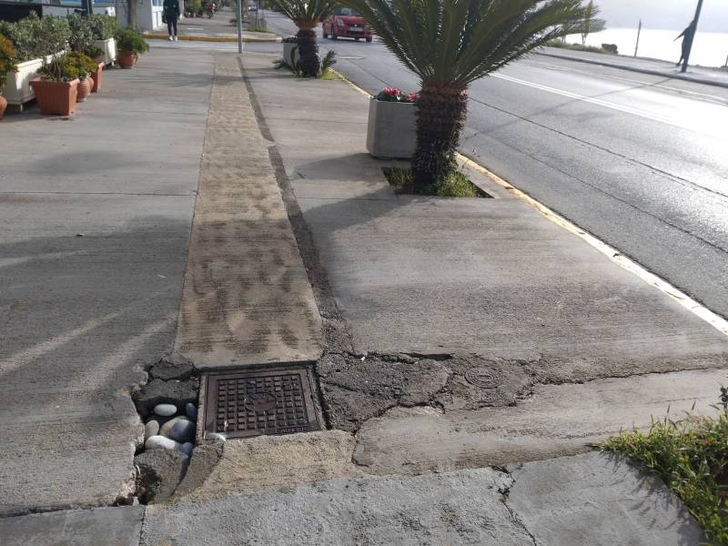 Με πέτρες από την παραλία έχει δοθεί… λύση, σε κενό που έχει δημιουργηθεί στο βόρειο πεζοδρόμιο της Ναυαρίνου, στο ύψος της Μεσογείων.