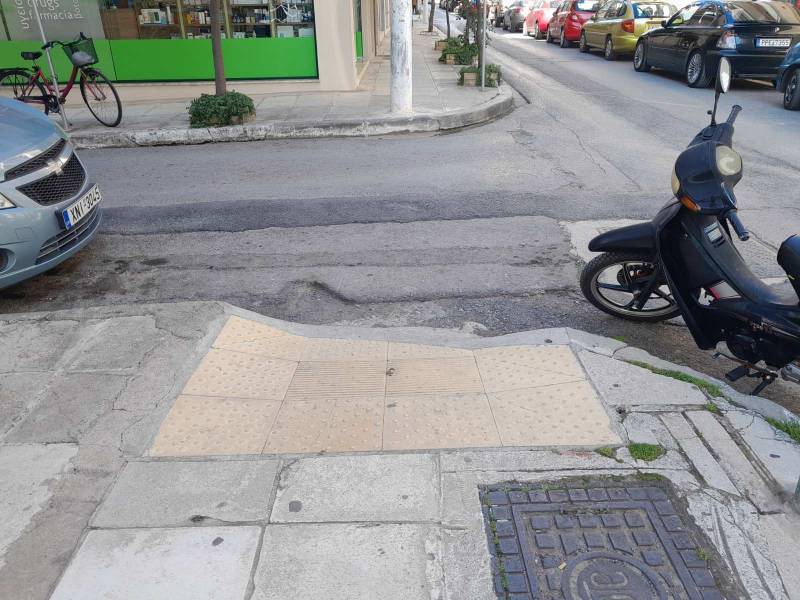 Η ράμπα για τα ΑμεΑ σταματάει, δεν συνεχίζεται. Τα άτομα με αναπηρία πρέπει να κατέβουν στον δρόμο, για να συνεχίσουν προς την κεντρική πλατεία. Οταν τα ΑμεΑ δεν έχουν πρόσβαση στο κέντρο της πόλης, κάτι δεν πάει καλά.