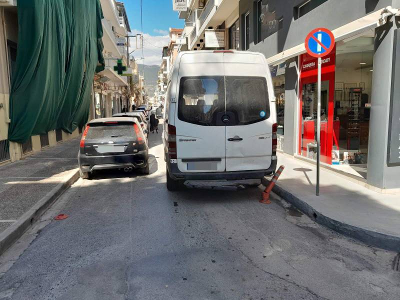 Διασταύρωση Αναγνωσταρά και Πολυχάρους, στο κέντρο της Καλαμάτας: Με τα πλαστικά κολονάκια στις γωνίες, που παραμένουν όρθια στη μία και στην άλλη έχουν εξαφανιστεί, ίσα που χωράνε να περάσουν τα ΙΧ.
