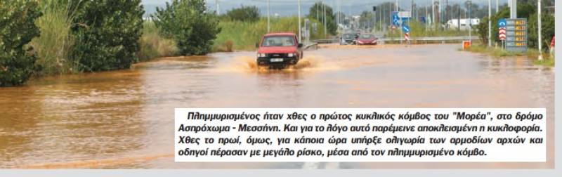 Η φωτογραφία με τον πλημμυρισμένο κόμβο του «Μορέα» στο δρόμο Ασπρόχωμα - Μεσσήνη δημοσιεύτηκε στην «Ε» στις 9 Σεπτεμβρίου 2016.