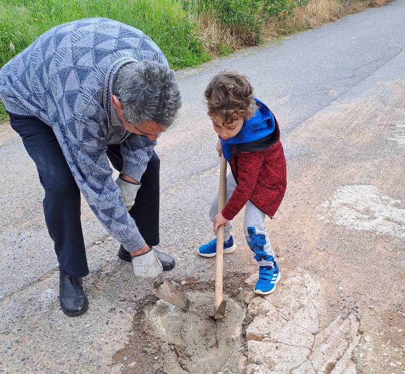 “Παππούς και εγγονός σε δημιουργική κυριακάτικη απασχόληση μπαλώνουν τρύπες στον δρόμο με τσιμέντο. Στην πολύπαθη οδό Ανοίξεως στα Ακοβίτικα, που οι κάτοικοι κάνουν αιτήσεις για ασφαλτόστρωση από το 2011…”. Το μεταφέρουμε κι επισημαίνουμε ότι η αδιαφορία πρέπει να πάρει τέλος.