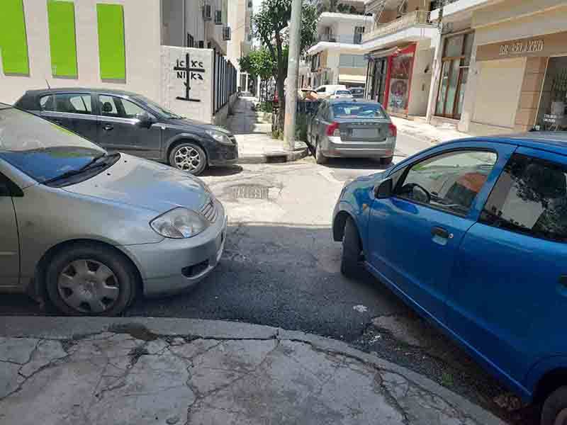 Παρκάρισμα στις γωνίες στο κέντρο της Καλαμάτας -πάλι καλά που έχει μείνει χώρος για να περάσουν οι πεζοί…