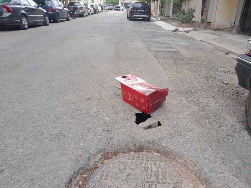 Εχει τοποθετηθεί πρόχειρα ένα χαρτοκούτι, αλλά αυτό δεν περιορίζει τον κίνδυνο. Αμέσως πρέπει να γίνει η αποκατάσταση, γιατί αν πέσει μέσα κάποιο αυτοκίνητο θα πάθει σοβαρή ζημιά.
