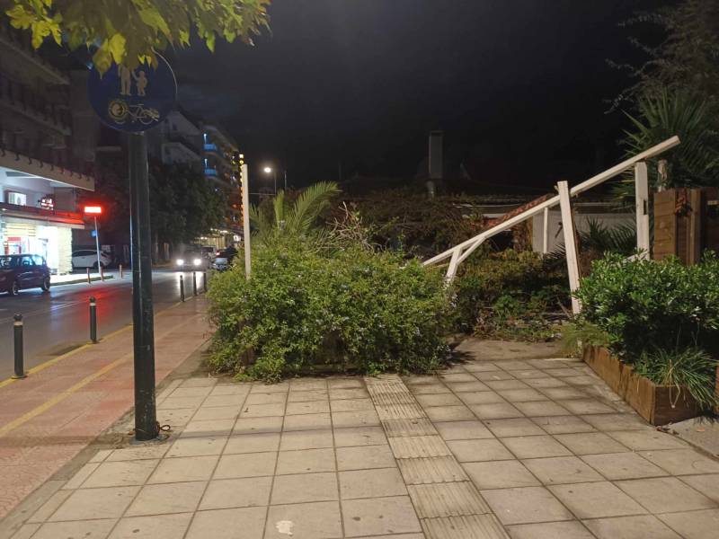 Τόσο η ταμπέλα όσο και η αυτοσχέδια σκεπή με κλαδιά βρέθηκαν στο έδαφος λόγω των δυνατών ανέμων, με αποτέλεσμα να κλείσει η άτυπη δίοδος που είχαν οι πεζοί στο συγκεκριμένο σημείο, μιας και το πεζοδρόμιο δίνει τη θέση του στον ποδηλατόδρομο για αρκετά μέτρα.