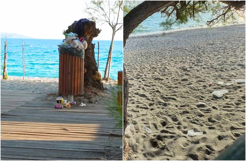 Ο άκρως καλοκαιρινός καιρός έχει φέρει πρόωρα δεκάδες λουόμενους στην ακτή, με αποτέλεσμα να υπάρχουν ξεχειλισμένα καλαθάκια απορριμμάτων με σκουπίδια τριγύρω, που πολλές φορές καταλήγουν στη θάλασσα. Στο ίδιο κλίμα, παρέες που απολαμβάνουν το φαγητό τους στην παραλία παρατάνε ό,τι δεν τους χρειάζεται στην άμμο, θεωρώντας μάλλον δύσκολη τη διαδικασία να τα μαζέψουν σε μια σακούλα και να τα αφήσουν στον πρώτο άδειο κάδο που θα βρουν.