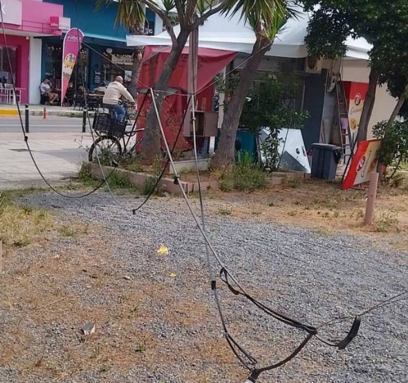 Καλώδια κρέμονται στη νότια πλευρά της οδού Ναυαρίνου, στην Παραλία της Καλαμάτας, στο ύψος του προλιμένα, κοντά στην παιδική χαρά.