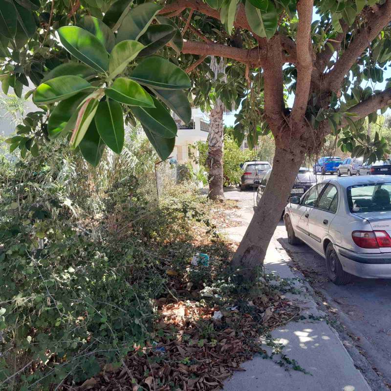 Δέντρο στη μέση του πεζοδρομίου και βάτα που έχουν εγκαταλειφθεί εδώ και καιρό, υποχρεώνουν τους πεζούς να κατέβουν στον δρόμο για να κινηθούν, σε ένα σημείο που τώρα το καλοκαίρι έχει ιδιαίτερα αυξημένη κυκλοφορία και έχει μετατραπεί σε ένα από τα πιο ελκυστικά πάρκινγκ της παραλιακής ζώνης.