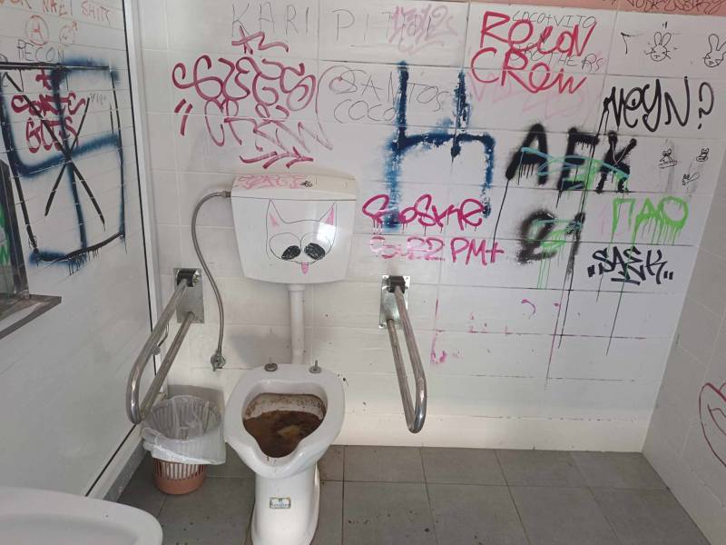 Όπως φαίνεται στη φωτογραφία, η λεκάνη για τα ΑμεΑ είναι βουλωμένη και ξεχειλισμένη από ακαθαρσίες και χαρτιά, ενώ ο χώρος γενικότερα έχει γεμίσει με επιγραφές και μουντζούρες.