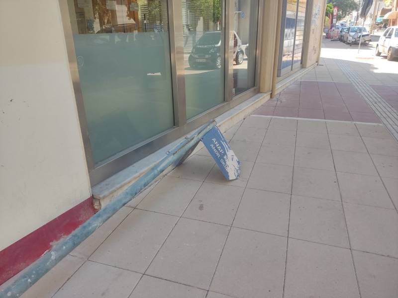 Στο αναπλασμένο πεζοδρόμιο της οδού Βασ. Όλγας, στο κέντρο της Καλαμάτας, βρίσκονται παρατημένες και ξαπλωμένες οι ενημερωτικές πινακίδες για τις οδούς.