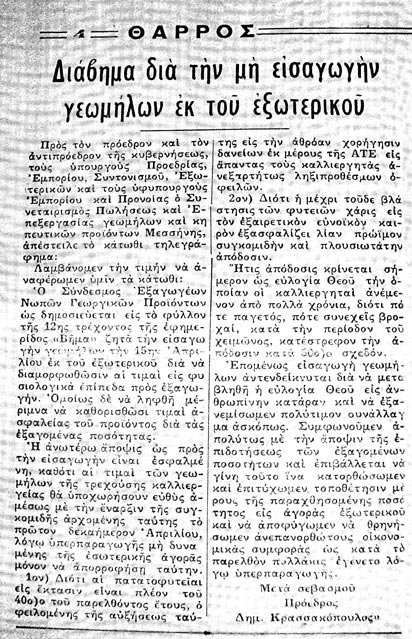 Είναι υπόθεση δεκαετιών και η πρώτη αναφορά που βρήκα είναι ακριβώς πριν 50 χρόνια. Με τίτλο «Διάβημα δια την μη εισαγωγήν γεωμήλων εκ του εξωτερικού» στις 17 Μαρτίου 1964 δημοσιεύτηκε στο "Θάρρος" επιστολή του τότε προέδρου του Συνεταιρισμού Μεσσήνης Δημ. Κρασσακόπουλου με την οποία ζητείται να μην γίνει εισαγωγή πατάτας γιατί τότε «θα μεταβληθεί η ευλογία Θεού εις ανθρώπινην κατάραν». Και τότε υπολόγιζαν ότι η πατάτα θα έβγαινε το πρώτο δεκαήμερο του Απριλίου και θα είχε καλή απόδοση η οποία «κρίνεται ως ευλογία Θεού την οποίαν οι καλλιεργηταί ανέμενον από πολλά χρόνια, διότι πότε ο παγετός, πότε συνεχείς βροχαί, κατά την περίοδον του χειμώνος, κατέστρεφον την απόδοσιν κατά 50% σχεδόν». Εξαιρετική ομοιότητα μετά από 50 χρόνια ακόμη και στις κλιματολογικές συνθήκες που επικράτησαν.