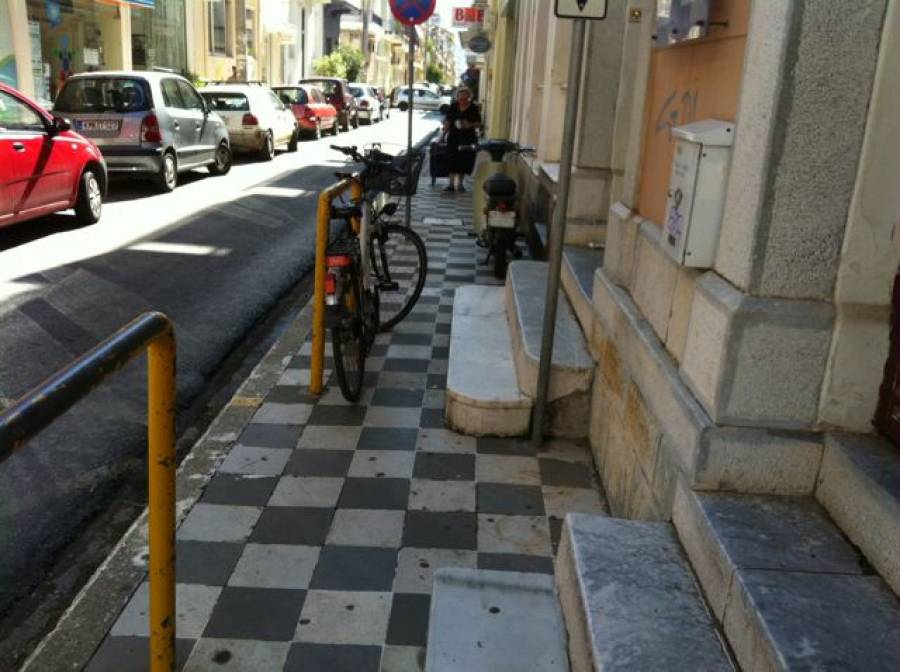 Το πεζοδρόμιο από την κατασκευή του στενό, από τη μία πλευρά τα σκαλια του κτιρίου, από την άλλη το κιγκλίδωμα πάνω στο οποίο είναι δεμένο ένα ποδήλατο και ελάχιστα μέτρα πιο πέρα σταθμευμένο ένα μηχανάκι. Και στο βάθος μία ηλικιωμένη γυναίκα με το καροτσάκι των αγορών της πλησιάζει να περάσει από το σημείο.