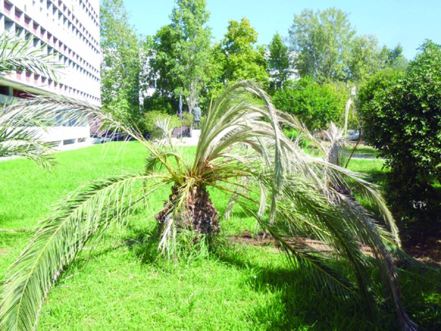 Σε άσχημη κατάσταση βρίσκονται και οι δύο μικροί φοίνικες στο παρκάκι μπροστά από το Διοικητήριο Μεσσηνίας.