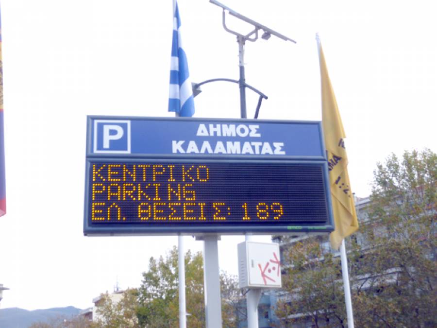 Λειτουργεί η ηλεκτρονική πινακίδα του Δήμου Καλαμάτας στο νότιο μεγάλο πάρκινγκ του Νέδοντα, που ενημερώνει για τις ελεύθερες θέσεις.