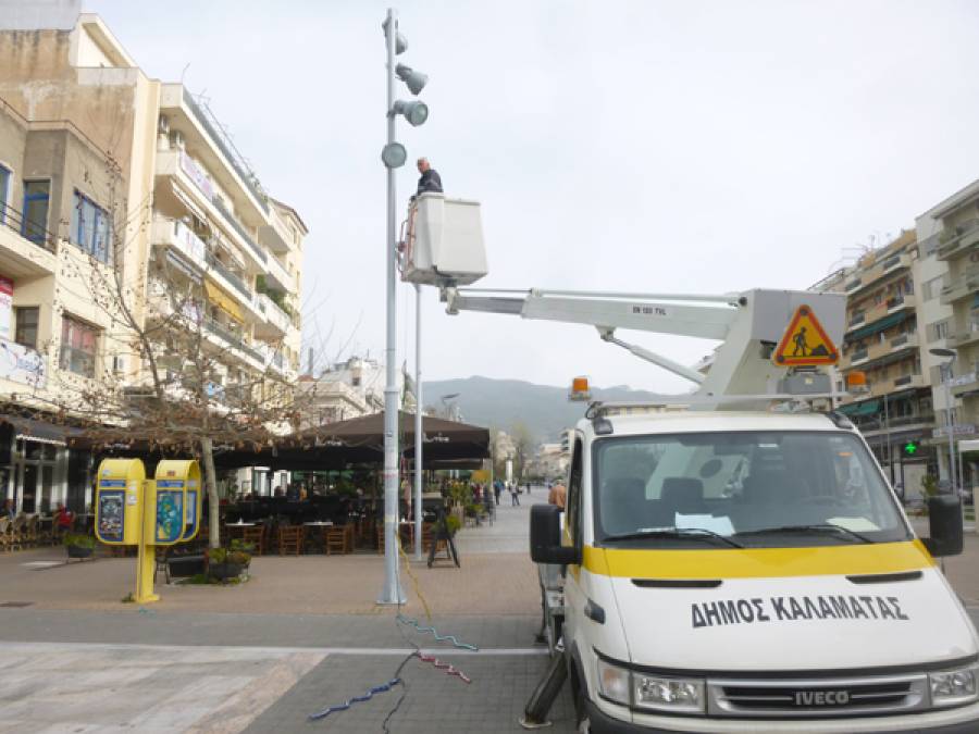 Τον αποκριάτικο στολισμό στην κεντρική πλατεία της Καλαμάτας, τοποθετούσε χθες το πρωί, συνεργείο του δήμου με το καινούργιο καλαθοφόρο.