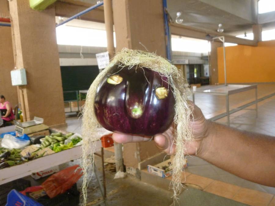 Μια πρωτότυπη μελιτζάνα κυκλοφορούσε χθες στη λαϊκή της Κεντρικής Αγοράς Καλαμάτας και προκαλούσε το ενδιαφέρον πελατών και παραγωγών.