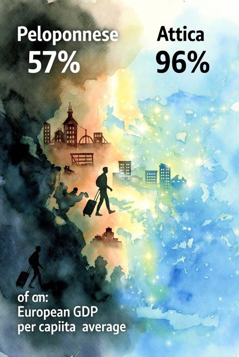 Το ΑΕΠ ανά κάτοικο παρέμεινε καθηλωμένο στο 57% του ευρωπαϊκού μέσου όρου για το 2024. Αυτή η απόσταση των 43 ποσοστιαίων μονάδων αποτυπώνει μια δομική υστέρηση, που παραμένει αμετάβλητη και υπονομεύει κάθε προοπτική κοινωνικής συνοχής. Η σύγκριση με την Αττική κάνει την εικόνα ακόμα πιο απογοητευτική. Ενώ η Περιφέρεια Πελοποννήσου παλεύει με το 57%, η πρωτεύουσα αγγίζει το 96% και προσεγγίζει τον ευρωπαϊκό μέσο όρο. Αυτή η τεράστια εσωτερική ανισότητα μετατρέπει την Αττική σε έναν πανίσχυρο πόλο έλξης, που απορροφά το πολυτιμότερο κεφάλαιο της Πελοποννήσου: τους νέους επιστήμονες και το εξειδικευμένο ανθρώπινο δυναμικό της. Οι νέοι Πελοποννήσιοι αναζητούν ευκαιρίες στην πρωτεύουσα και στερούν από τον τόπο τους τη δυναμική που απαιτείται για την ανατροπή του σκηνικού. Η ερήμωση της υπαίθρου από παραγωγικές ηλικίες αποτελεί τη μεγαλύτερη πληγή, καθώς η Περιφέρεια χάνει όσους θα μπορούσαν να την εκσυγχρονίσουν.