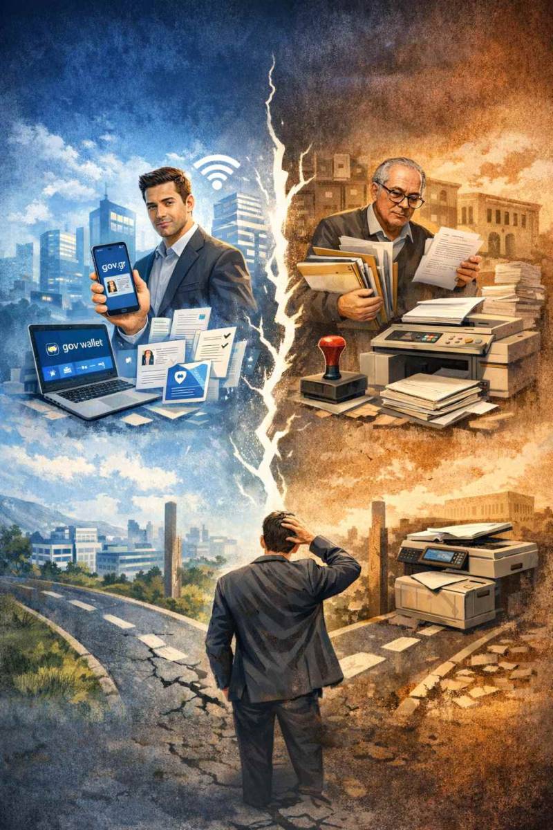 Το παράδοξο είναι ότι στον ψηφιακό αναχρονισμό πρωταγωνιστούν συχνά μεγάλες επιχειρήσεις. Επιχειρήσεις με τεχνολογικές υποδομές και οικονομική δύναμη. Παρ’ όλα αυτά αρνούνται να αποδεχθούν ακόμη και την ψηφιακή ταυτότητα. Αν στο κάδρο προστεθούν και οι μικρές επιχειρήσεις που δυσκολεύονται να παρακολουθήσουν την τεχνολογική εξέλιξη, τότε η εικόνα γίνεται πιο καθαρή. Μπροστά μας βρίσκεται η Ελλάδα των δύο ψηφιακών ταχυτήτων: Από τη μία πλευρά ένα κράτος, που επιχειρεί να εκσυγχρονίσει τις διαδικασίες. Από την άλλη ένας ιδιωτικός τομέας, που σε μεγάλο βαθμό μένει κολλημένος στον προηγούμενο αιώνα. Και στη μέση ο πολίτης που συνεχίζει να ταλαιπωρείται.