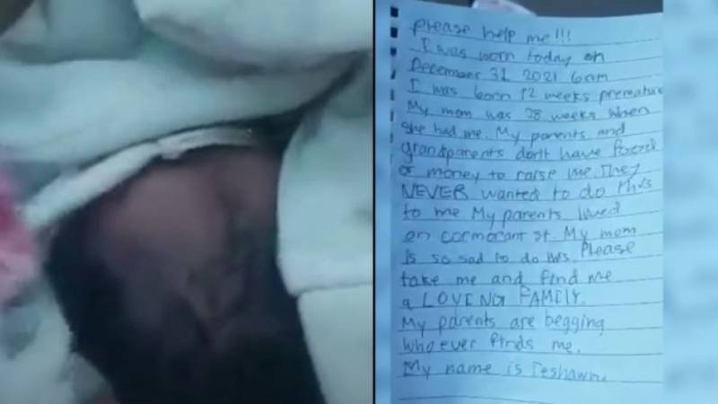 Το γράμμα, έγραφε: «Σε παρακαλώ βοήθησέ με! Γεννήθηκα σήμερα στις 31 Δεκεμβρίου 2021 στις 6 το πρωί. Γεννήθηκε 12 εβδομάδες πρόωρα. Η μητέρα μου με γέννησε στις 28 εβδομάδες. Οι γονείς και οι παππούδες μου δεν έχουν φαγητό και χρήματα για να με μεγαλώσουν. ΠΟΤΕ δεν ήθελαν να μου το κάνουν αυτό. Η μαμά μου είναι λυπημένη που με άφησε. Σε παρακαλώ πάρε με και βρες μου μια ΑΓΑΠΗΜΕΝΗ ΟΙΚΟΓΕΝΕΙΑ. Το όνομά μου είναι Teshawn».