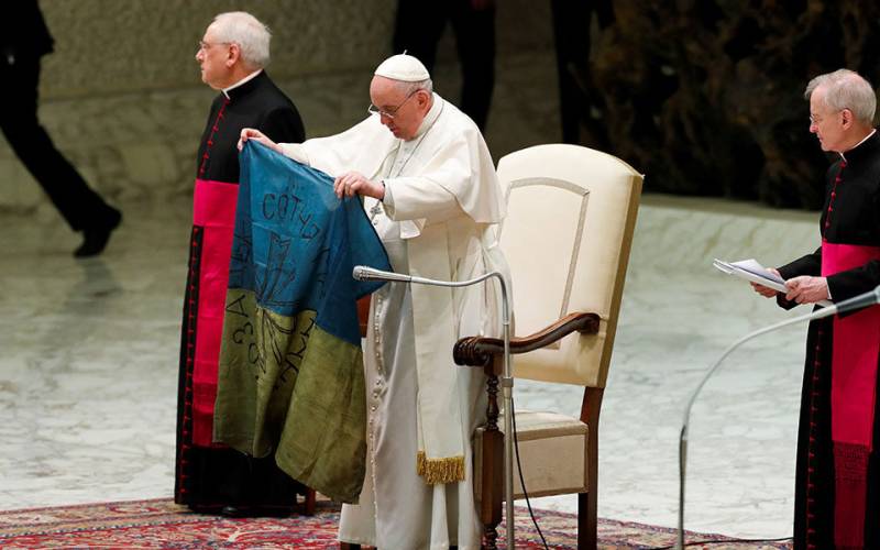 "Είναι από τον πόλεμο, ειδικά από αυτή την μαρτυρική πόλη, την Μπούτσα", είπε ο πάπας προτού καλέσει να πάει σε εκείνον μια ομάδα από προσφυγόπουλα που είχαν φθάσει χθες, Τρίτη, από την Ουκρανία.