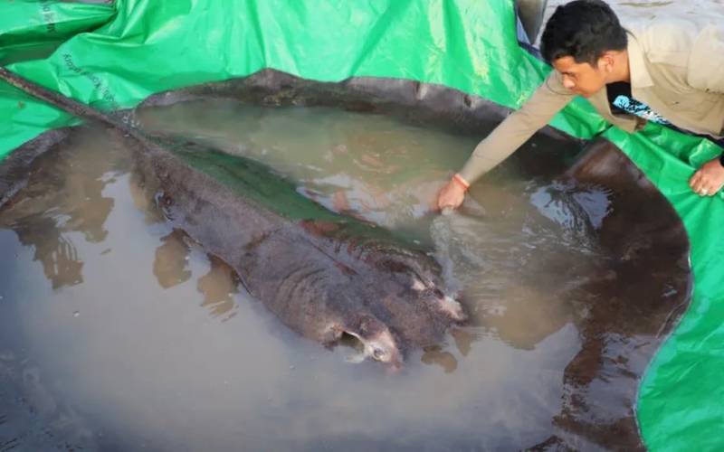 Χωρικοί στον ποταμό Μεκόνγκ στην Καμπότζη έπιασαν το μεγαλύτερο, σύμφωνα με τους επιστήμονες, ψάρι του γλυκού νερού που έχει καταγραφεί ποτέ, ένα σελάχι που ζύγιζε 300 κιλά και χρειάστηκαν δώδεκα άνδρες για να βγάλουν στην ακτή.