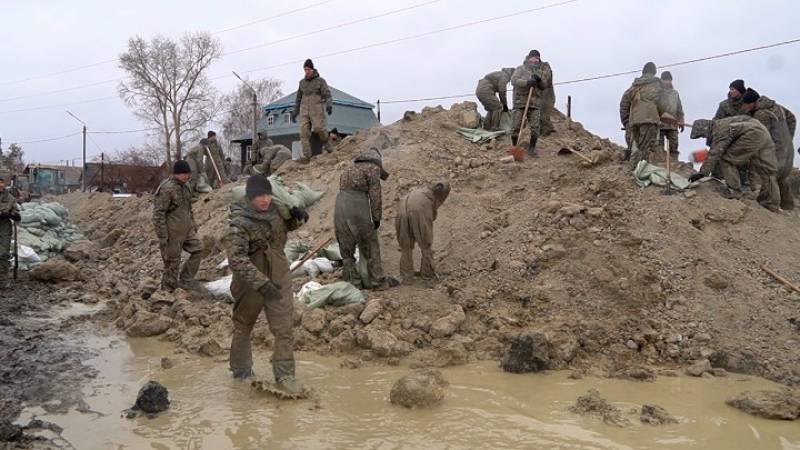 Στο Καζακστάν, οι άνθρωποι εργάζονταν όλη τη νύχτα για να κατασκευάσουν αναχώματα και να ενισχύσουν τις επιχωματώσεις.